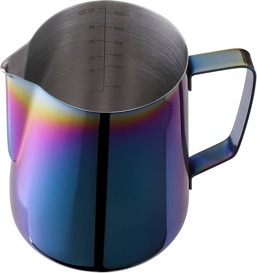 إبريق متين من الفولاذ المقاوم للصدأ، مصمم لرغوة حليب مثالية وسكب سلس ودقيق. مثالي لفن اللاتيه، وفناني تحضير القهوة في المنزل، والمقاهي الاحترافية.